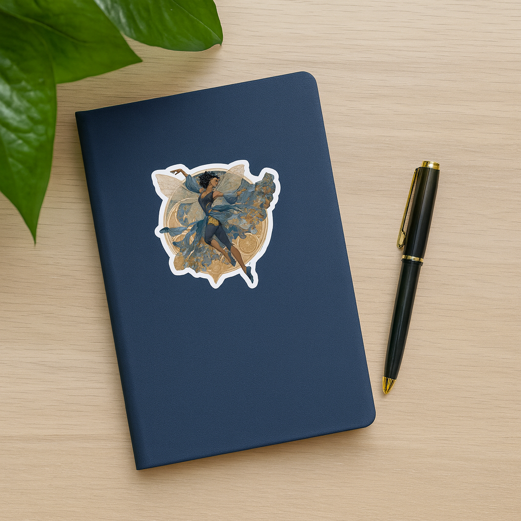 Dressed in deep blue and gold with intricate patterns, this fairy glows with mystery and power. Her sweeping pose and ornate wings evoke both grace and strength, making her a stunning addition for fantasy fans or lovers of intricate artwork. This sticker works beautifully as an accent on notebooks, sketchbooks, or craft projects.