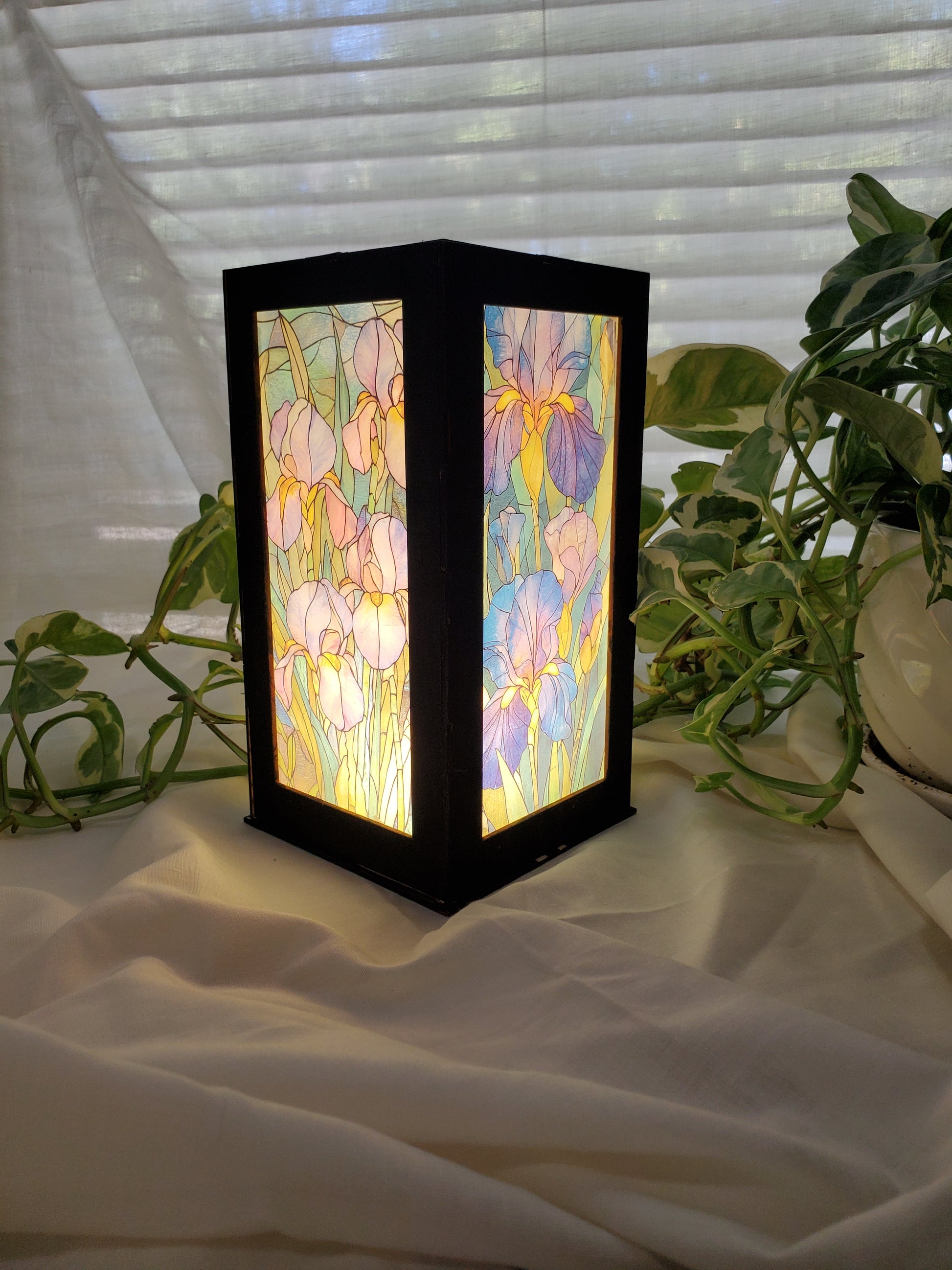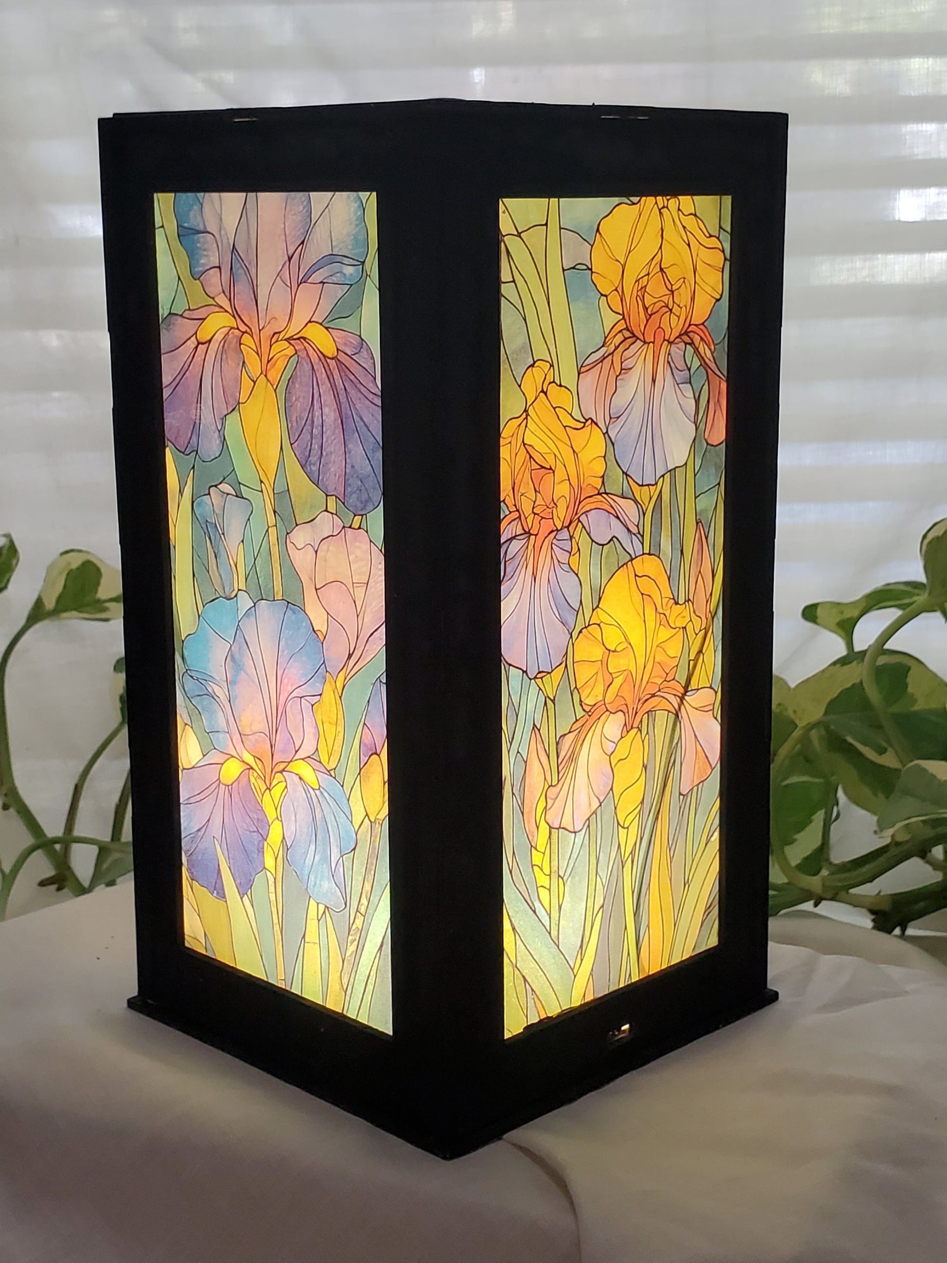 Brighten your space with this iris lantern, designed to look like a Tiffany-style stained glass lamp. The colorful floral panels glow beautifully with a built-in LED light, making it a perfect night light, desk light, or cozy room accent.